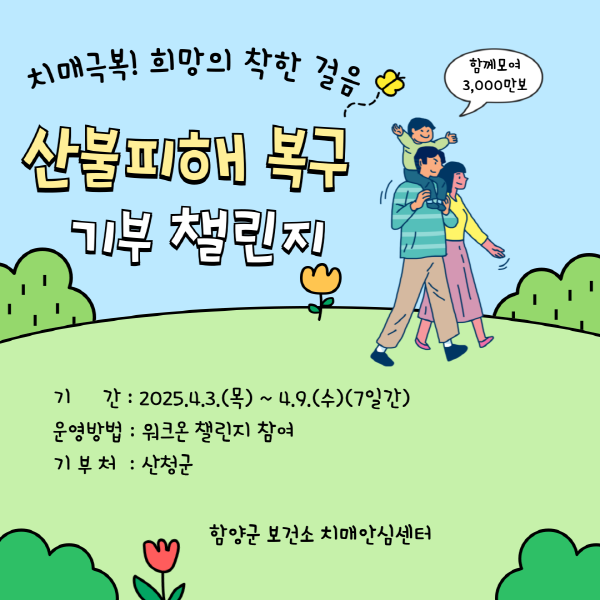 이번 행사는 치매 인식 개선과 사회적 공감대 확산을 위해 마련된 나눔 캠페인의 하나로, 최근 발생한 산불 피해 복구를 지원하기 위한 특별 기부 프로그램으로 진행되어 지역사회에 선한 영향력을 전파할 예정이다.