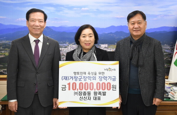 | ▲ ㈜장충동왕족발 신신자 대표 장학금 기탁 사진(사진=거창군) |