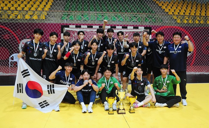 [프레스뉴스] 채정병 특파원=25일(현지시간) 요르단 암만 프린세스 수마이야 경기장에서 열린 제18회 아시아 남자 주니어 핸드볼 선수권대회 한-일 결승전에서 우리 대표팀이 32대27로 아쉽게 패하며 준우승을 거둔 가운데 대한민국 선수단이 다음 대회 필승을 다짐하며 화이팅 하고 있다.
