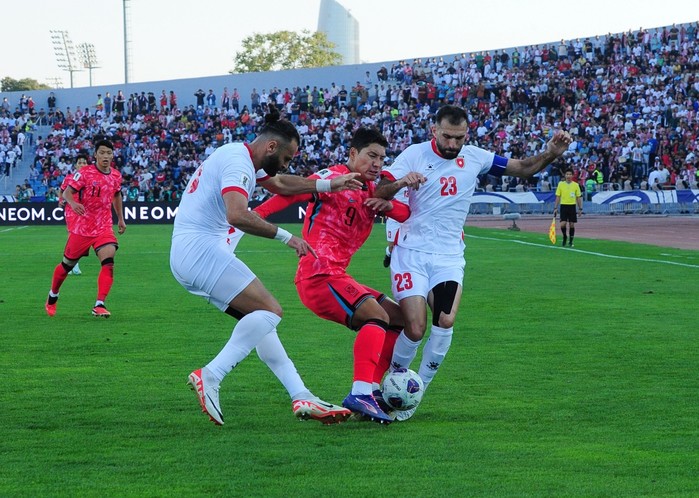 [프레스뉴스] 채정병 특파원=10일(현지시간) 대한민국 축구대표팀이 요르단 암만 국제경기장에서 열린 2026 북중미월드컵 아시아 3차 예선 B조 3차전 요르단과 원정경기에서 2-0으로 승리한 가운데 요르단이 주민규의 돌파를 가로막고 있다.
