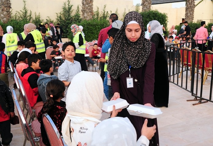 [프레스뉴스] 채정병 특파원=5일(현지시간) 요르단 청년자원봉사단체 '나흐누 알 아싸르(We are the Impact)' 회원들이 요르단의 결손가정과 빈곤층 아이들을 위해 라마단 이프타르(금식 후 첫 식사) 행사를 연 가운데 자원봉사자들이 음식을 나눠주고 있다.
