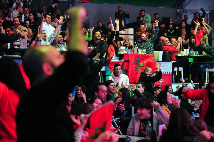 [프레스뉴스] 채정병 특파원=10일(현지시간) 2022 카타르 월드컵 모로코 대 포르투갈의 8강전에서 모로코의 결승골이 터지자 요르단 암만에서 스크린 응원을 펼치던 시민들이 환호하고 있다.