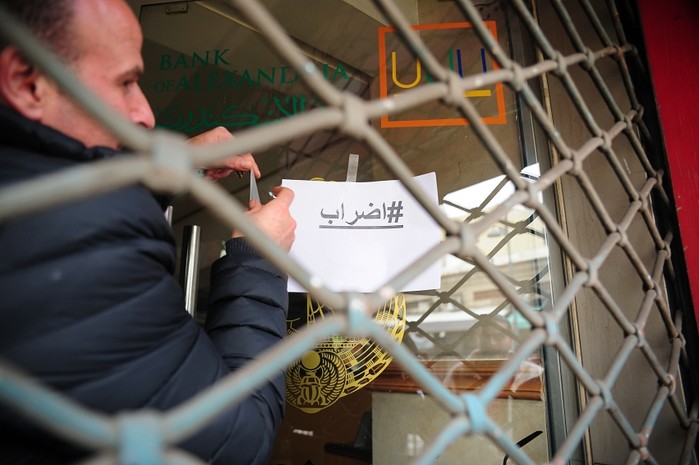 [프레스뉴스] 채정병 특파원=가자지구 팔레스타인인들과 연대의 의미로 요르단강 서안지구에서 벌인 총파업에 요르단도 민간 차원에서 동참한 가운데 11일(현지시간) 암만 다운타운의 한 환전소 사장이 ‘파업’이라고 쓴 문구를 붙이고 있다.
