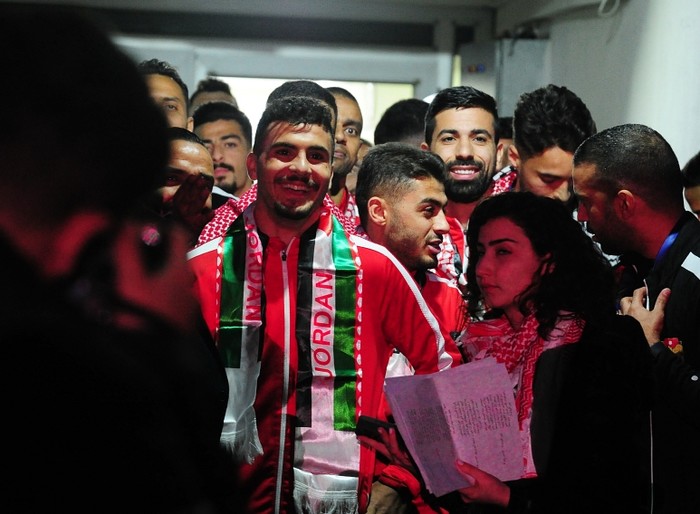 [프레스뉴스] 채정병 특파원=12일(현지시간) 2023 카타르아시안컵 준우승을 달성하고 돌아온 요르단 축구대표팀을 환영하는 행사가 암만 스포츠시티 메인스타디움에서 열린 가운데 선수들이 기쁜 표정을 지으며 호명을 기다리고 있다.