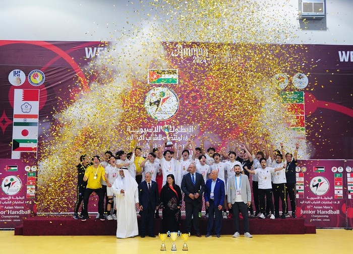 [프레스뉴스] 채정병 특파원=25일(현지시간) 요르단 암만 프린세스 수마이야 경기장에서 열린 제18회 아시아 남자 주니어 핸드볼 선수권대회 한-일 결승전에서 32대27로 승리한 일본 대표팀이 우승 트로피를 들어 올리며 기뻐하고 있다.