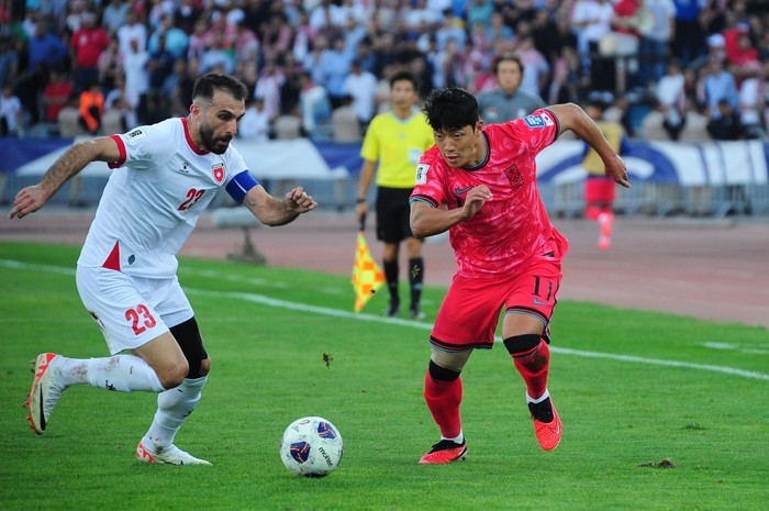 [프레스뉴스] 채정병 특파원=10일(현지시간) 대한민국 축구대표팀이 요르단 암만 국제경기장에서 열린 2026 북중미월드컵 아시아 3차 예선 B조 3차전 요르단과 원정경기에서 2-0으로 승리한 가운데 쇄도하는 황희찬을 하다드가 따라붙고 있다.