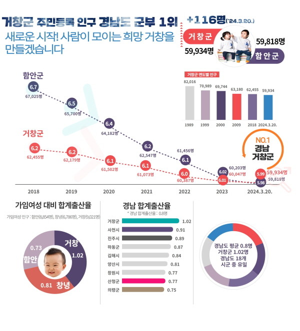 지난 3월 12일 거창군 인구수는 함안군을 앞서기 시작했고, 3월 20일 기준 거창군 인구수는 59,934명으로, 함안군(59,818명)을 116명이라는 큰 차이로 추월했다.