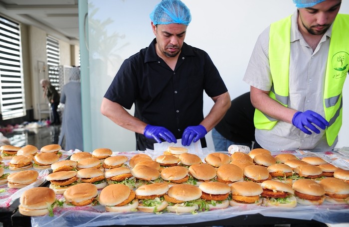 [프레스뉴스] 채정병 특파원=5일(현지시간) 요르단 청년자원봉사단체 '나흐누 알 아싸르(We are the Impact)' 회원들이 요르단의 결손가정과 빈곤층 아이들을 위해 라마단 이프타르(금식 후 첫 식사) 행사를 연 가운데 자원봉사자들이 정성껏 햄버거를 만들고 있다.