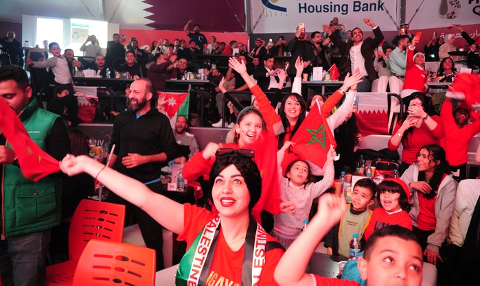 [프레스뉴스] 채정병 특파원=10일(현지시간) 2022 카타르 월드컵 모로코 대 포르투갈의 8강전에서 모로코의 결승골이 터지자 요르단 암만에서 스크린 단체응원을 펼치던 시민들이 모로코 국기를 들고 기뻐하고 있다.