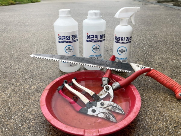 공급된 소독용 알코올은 복장(작업화, 장갑 작업복 등), 소형도구(전지가위, 톱 등), 대형농기구(분무기, 예초기, 경운기) 소독에 사용되며, 소독 방법은 70% 알코올이나 유효약제(차아염소산나트륨 등) 0.2% 함유 락스 또는 일반락스 20배 희석액에 도구를 90초 이상 담그거나 분무기로 살포하면 된다.