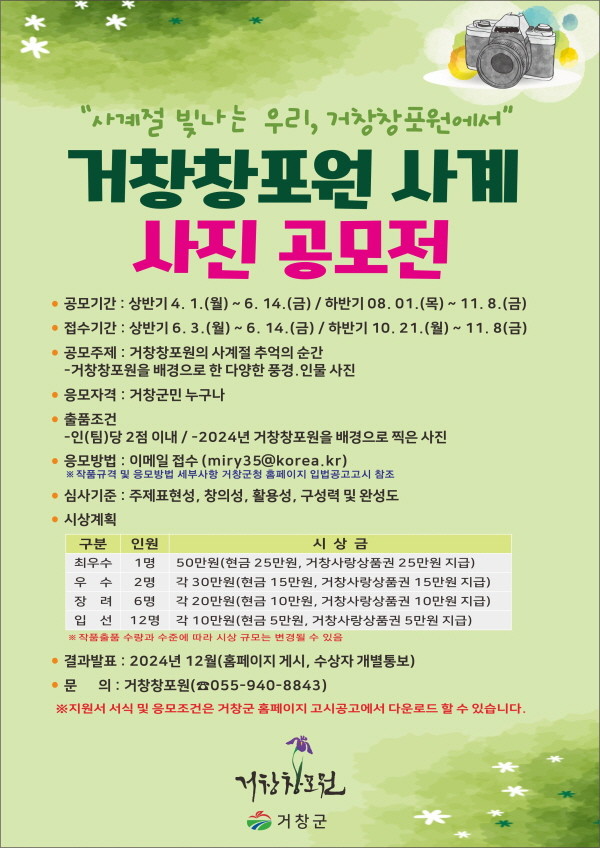 공모전 접수는 21일부터 11월 8일 18시까지 이메일(miry35@korea.kr)로 제출해야 하며, ‘거창창포원 사계절 추억의 순간’을 주제로 거창창포원을 배경으로 한 다양한 풍경 및 인물 사진을 제출하면 된다.