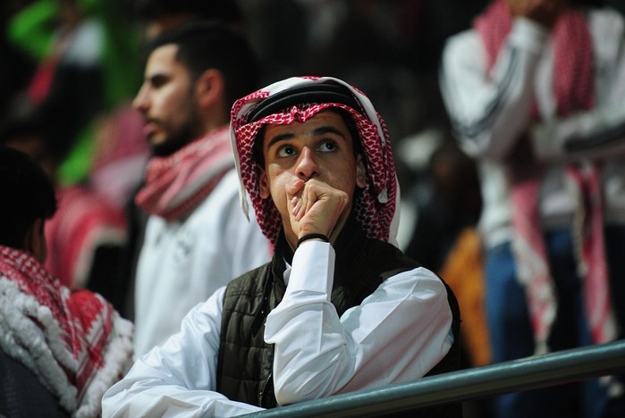 [프레스뉴스] 채정병 특파원=10일(현지시간) 2023년 아시아축구연맹(AFC) 아시안컵 결승전 요르단 대 카타르의 경기에서 요르단을 응원하기 위해 암만 스포츠시티에 모인 시민들 가운데 한 남성이 경기 종료시간이 다가오자 초조한 표정을 짓고 있다. 경기는 카타르가 3대1로 우승했다.