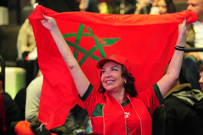 [프레스뉴스] 채정병 특파원=10일(현지시간) 2022 카타르 월드컵 모로코 대 포르투갈의 8강전이 펼쳐진 가운데 요르단 암만에서 한 여성이 붉은색 모로코 국기를 펼치며 응원하고 있다.