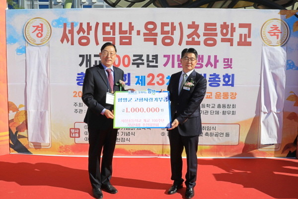 이날 ‘서상초등학교 개교 100주년 기념행사 및 총동창회’ 현장에서 함양군의 희망찬 미래를 함께하고자 함양군에 고향사랑기부금 100만 원을 기탁했다.
