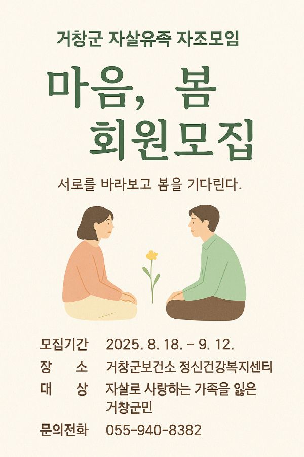 ▲ 거창군 자살 유족 자조 모임 ‘마음 봄’ 참여자 모집 포스터(사진=거창군) |