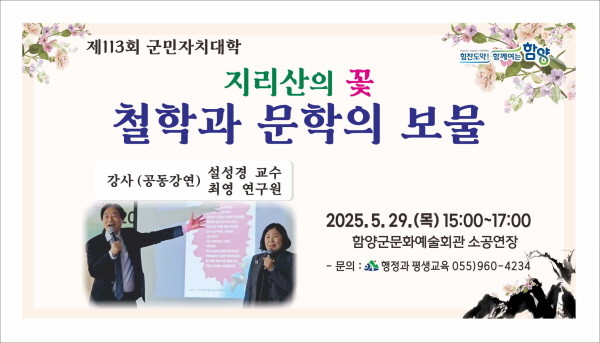 이번 강연은 ‘지리산의 꽃-철학과 문학의 보물’이라는 주제로, 고운 최치원, 일두 정여창, 점필재 김종직, 연암 박지원, 개암 강익 등 지리산을 품은 함양의 인물들이 지닌 선비정신과 문학적 자취를 조명하며, 특히 함양의 전통 설화인 변강쇠타령을 새롭게 바라보며 함양 문화의 미래상도 탐색한다.