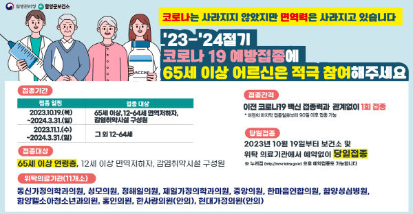 접종에는 지금 유행하는 바이러스에 효과적인 XBB.1.5 기반 화이자·모더나 백신이 활용되며, 과거 접종력과 상관없이 마지막 접종일로부터 최소 90일 이후 1회 접종으로 접종이 완료된다.