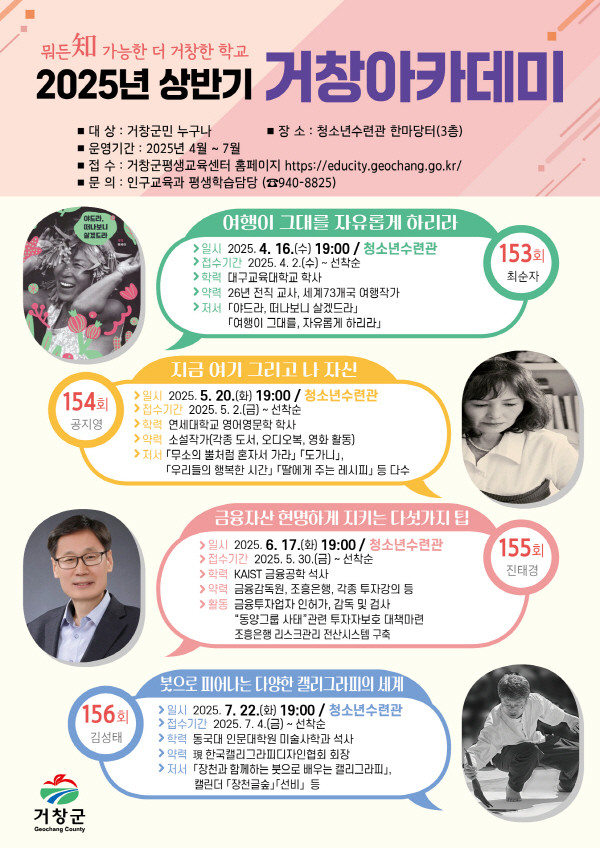 2025년 상반기 거창아카데미는 △4월 16일 최순자 여행작가의 ‘여행이 그대를 자유롭게 하리라’ △5월 20일 공지영 소설가의 ‘지금 여기 그리고 나 자신’ △6월 17일 진태경 투자전문가의 ‘금융자산 현명하게 지키는 다섯 가지 팁’ △7월 22일 김성태 캘리그래피 강사의 ‘붓으로 피어나는 다양한 캘리그래피의 세계’로 구성되어 있다.