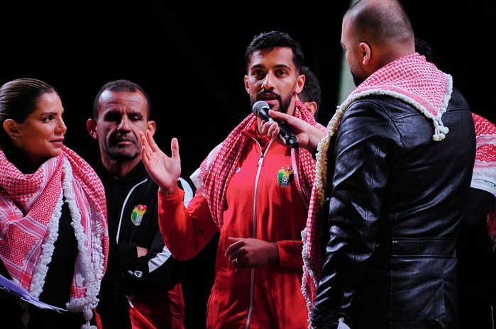 [프레스뉴스] 채정병 특파원=12일(현지시간) 2023 카타르아시안컵 준우승을 달성하고 돌아온 요르단 축구대표팀을 환영하는 행사가 암만 스포츠시티 메인스타디움에서 열린 가운데 요르단 에이스 무사 알 타마리(몽펠리에)가 시민들을 향해 답례하고 있다.