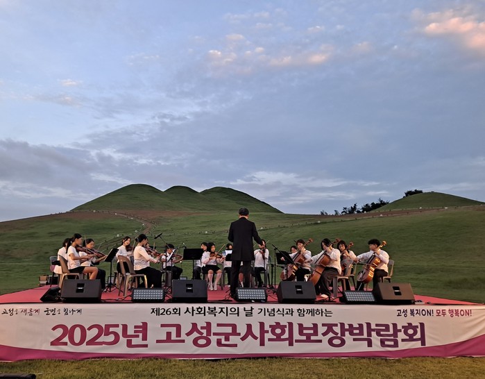 ▲고성군청소년센터 “온”(센터장 이진만) 소속 현악3중주-ON악단이 9월 26일 송학동 고분군에서 열린 제26회 사회복지의 날 기념식 및 2025년 고성군사회보장박람회 무대에 올라 첫 공연을 선보였다. (사진=고성군) |