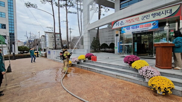 이번 훈련은 연막탄을 사용하여 실제 화재 발생 상황을 재연했으며, 최초 발견자의 상황전파 및 119 신고를 시작으로 거창읍 자체 자위소방대의 인명대피와 구조, 소화기와 옥내 소화전을 활용한 초기진화 순으로 진행됐다.