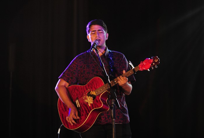 [프레스뉴스] 채정병 특파원=31일(현지시간) 2022 케이팝 월드 페스티벌 요르단 지역예선이 암만 문화궁전에서 열린 가운데 한 참가자가 감성적 연주와 노래를 선보이고 있다.