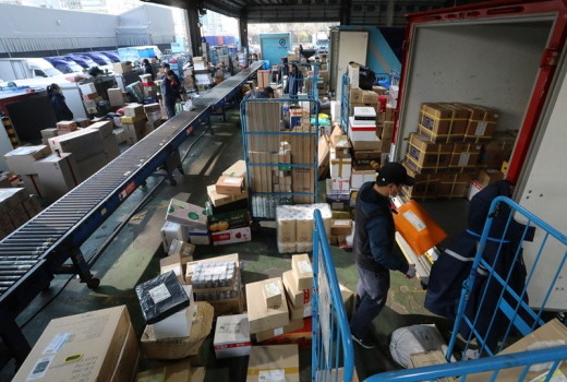 | ▲서울 금천구 가산동 한진 남서울 터미널에서 택배기사들이 배송준비 작업을 하고 있는 모습.(사진= 뉴스1) |