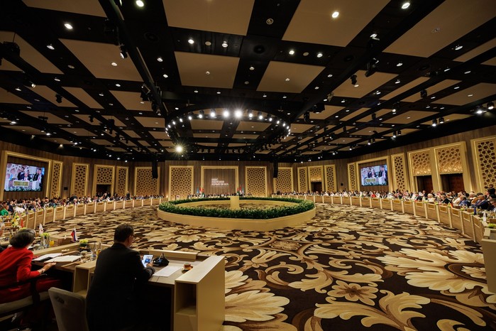 | 세계 각국의 정상과 총리, 외무장관, 국제기구 대표들이 한자리에 모여 가자지구 지원을 위한 공동대응 회의를 하고 있다. (사진=요르단왕실 제공) |