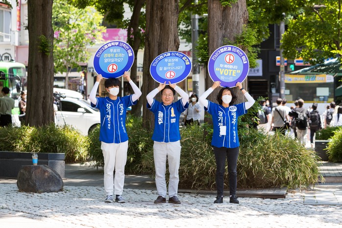 합동기자회견이 끝난 뒤에는 곧바로 거리로 나섰다. 청년 세대 표심 잡기에 공을 들였던 강 후보는 전날 금남로와 아시아문화전당 일대 벌였던 청년거리유세에 이어 이날 모교인 전남대를 찾아 가족들과 함께 지지를 호소했다.