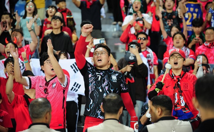 [프레스뉴스] 채정병 특파원=10일(현지시간) 대한민국 축구대표팀이 요르단 암만 국제경기장에서 열린 2026 북중미월드컵 아시아 3차 예선 B조 3차전 요르단과 원정경기에서 2-0으로 승리한 가운데 붉은악마 응원단이 승리의 기쁨을 표현하고 있다.