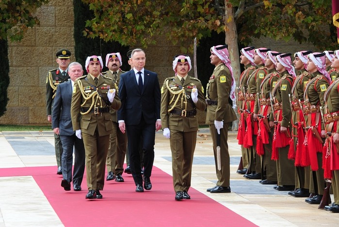[프레스뉴스] 채정병 특파원=19일(현지시간) 요르단-폴란드 수교 60주년을 맞아 요르단을 방문한 안제이 두다 폴란드 대통령이 알 후세이니아 궁전에서 열린 공식 환영식에서 압둘라 2세 요르단 국왕과 왕실 의장대를 사열하고 있다.