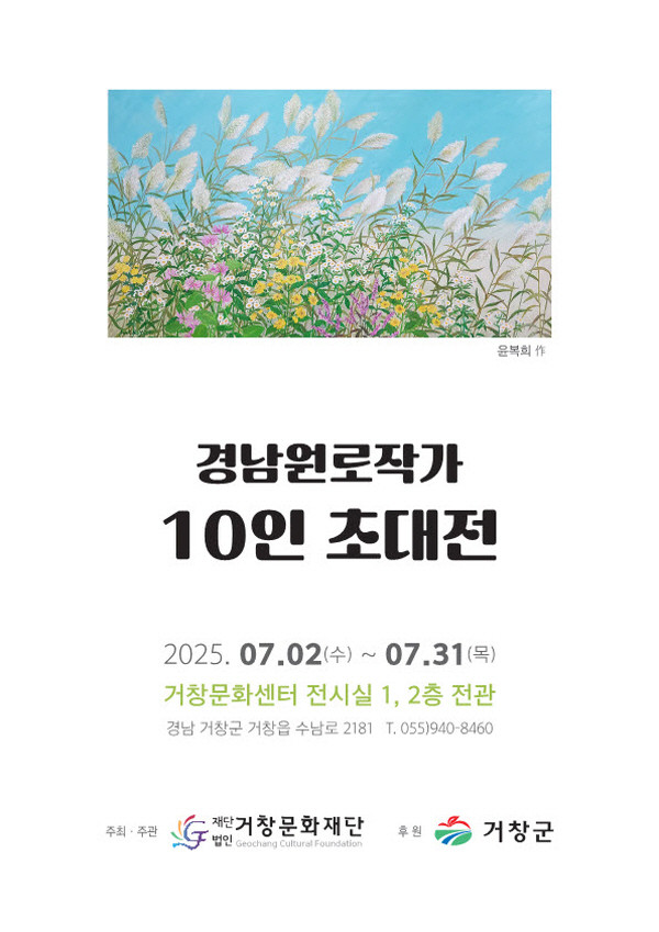 2025년 거창문화재단 ‘경남원로작가 10인 초대전’에 대한 자세한 사항은 거창문화재단 홈페이지(gccf.or.kr)를 참고하거나 전화(☎055-940-8453)로 문의하면 된다.