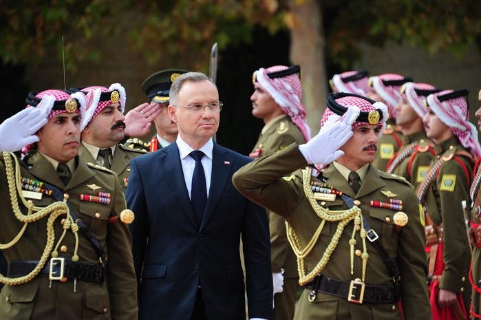 [프레스뉴스] 채정병 특파원=19일(현지시간) 요르단-폴란드 수교 60주년을 맞아 요르단을 방문한 안제이 두다 폴란드 대통령이 알 후세이니아 궁전에서 열린 공식 환영식에서 요르단 왕실 의장대를 사열하고 있다.