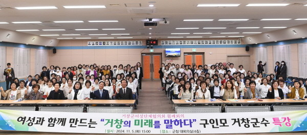 이날 특강에서 구인모 군수는 민선 8기 거창군의 목표와 비전을 설명하고, 동서남북 관광벨트 완성, 경남도 군부 인구 1위 달성 등의 주요 성과를 공유하며 여성단체 회원들과 활발한 소통의 시간을 가졌다.