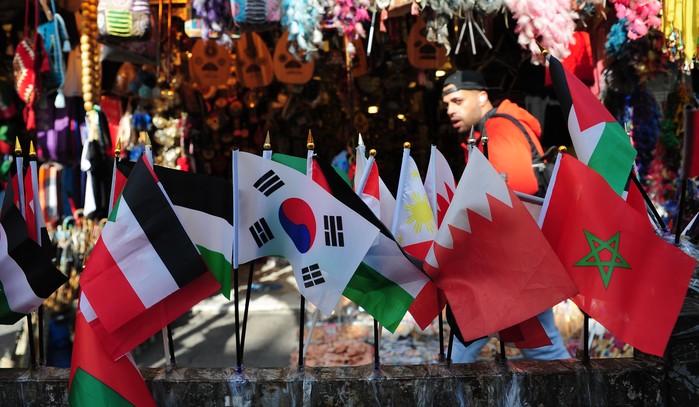 [프레스뉴스] 채정병 특파원=24일(현지시간) 중동에서 최초로 열린 2022 카타르 월드컵이 개막된 가운데 이웃나라 요르단 암만 다운타운의 한 기념품 상점에서 장식한 국기들이 사람들의 시선을 끌고 있다.