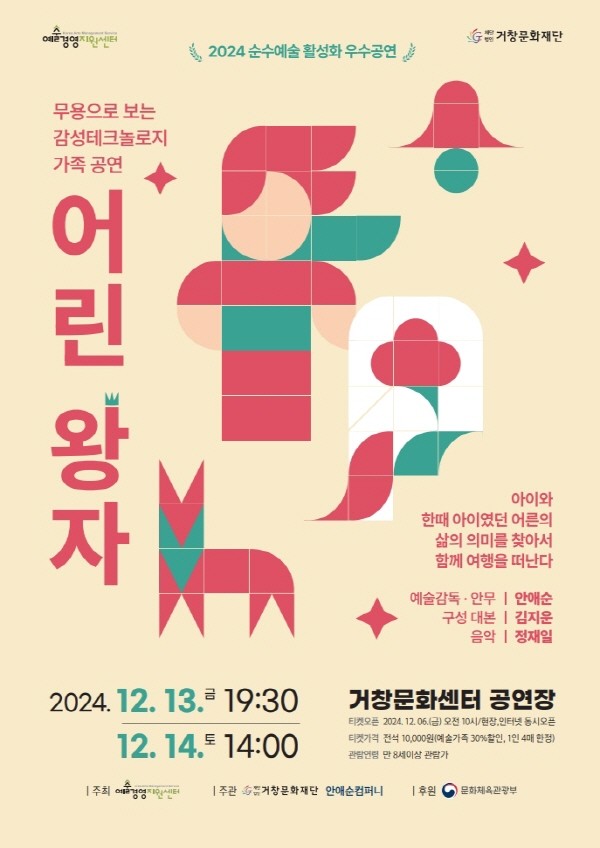 ‘어린왕자’는 전 석 10,000원으로 1인당 4매까지 구매가 가능하며, 12월 6일 오전 10시부터 거창문화재단 홈페이지(gccf.or.kr)와 거창문화센터 공연장 로비에서 예매할 수 있다.
