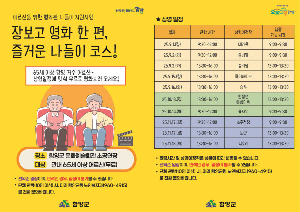 자세한 일정 및 상영작은 함양군 누리집 게시판을 통해 확인할 수 있으며, 만 65세 이상 어르신이라면 누구나 무료로 관람할 수 있다.