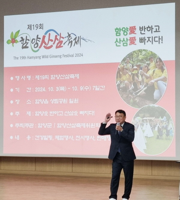지난 8일 지방자치인재개발원 2024년 제3기 5급 승진리더과정에 참여하고 있는 함양군 산삼항노화과 김복수 과장은 교육 과정 중 분임발표 시간을 활용하여 함양산삼축제를 적극적으로 홍보했다.
