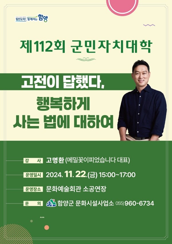 이번 강연은 함양군민이면 누구나 무료로 관람할 수 있다. 자세한 사항은 함양군문화시설사업소 평생학습담당(960-6734)으로 문의하면 된다.
