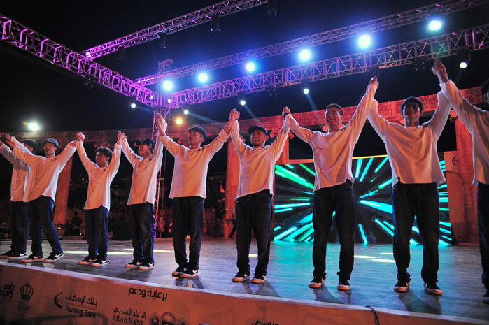[프레스뉴스] 채정병 특파원=1일(현지시간) 세계적인 대한민국 비보이 그룹 진조크루의 요르단 특별공연이 제라쉬 페스티벌 야외무대에서 펼쳐진 가운데 공연을 마치고 관객들을 향해 인사하고 있다.