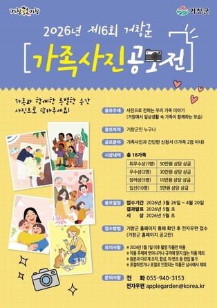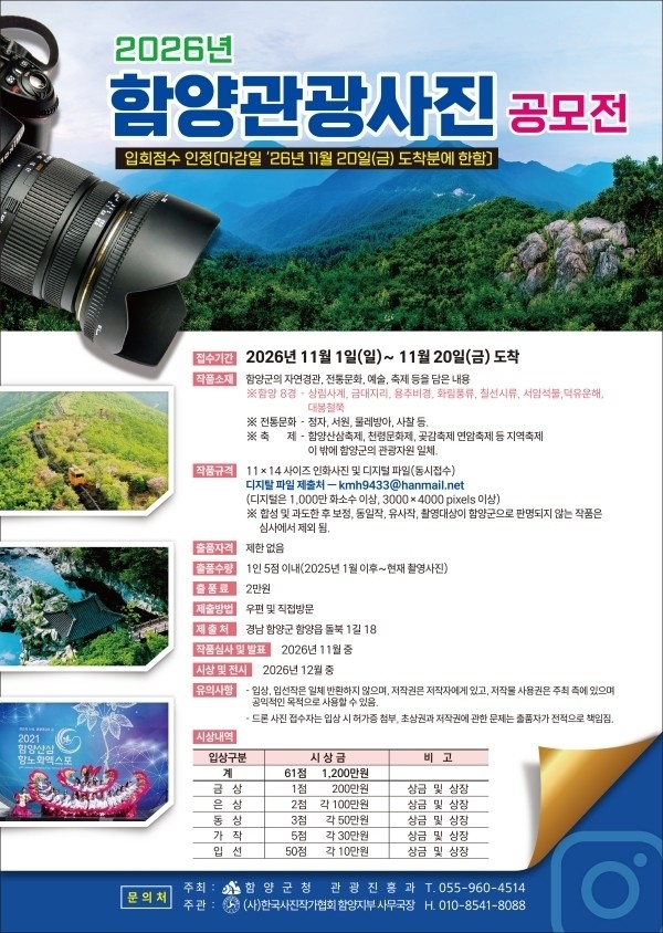 공모 주제는 ▲함양 8경 ▲전통문화 ▲지역축제 ▲‘오르GO 함양’ 명산 ▲기타 관광자원 등으로, 함양군을 대표하는 다양한 관광 소재를 담은 미발표 사진이면 응모할 수 있다.