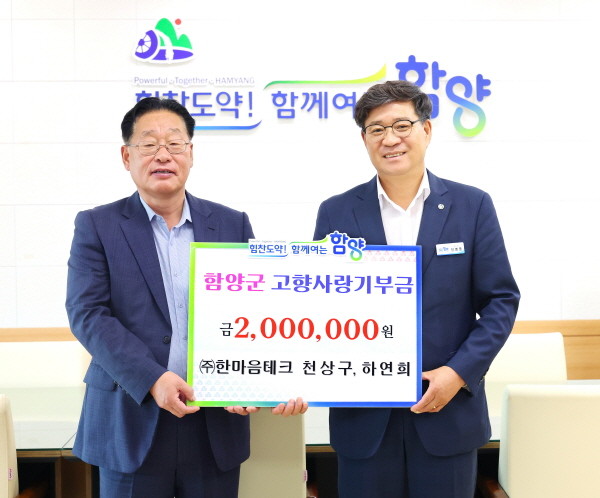 ▲ ㈜한마음테크 천상구·하연희 대표 고향사랑기부금 200만 원 전달(사진=함양군) |