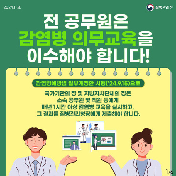 일반 공무원은 매년 1시간 이상, 지역보건의료기관 및 보건진료소 소속 공무원은 매년 4시간 이상, 감염병예방법 시행령에 따라 임명된 역학조사반원은 매년 10시간 이상의 교육을 이수해야 한다.