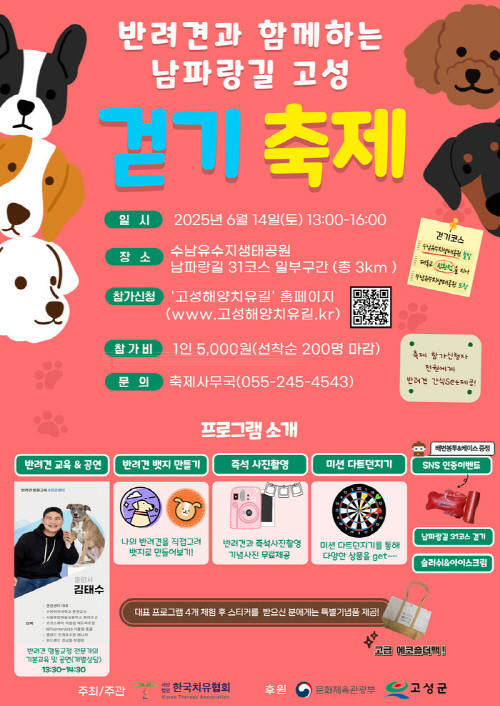 행사는 오후 1시부터 4시까지 진행되며, (사)한국치유협회가 주최하고 고성군이 후원한다. 코리아둘레길 남파랑길 31코스 일부와 수남유수지 생태공원을 배경으로 참가자들은 반려견과 함께 걷고 다양한 체험 활동에 참여할 수 있다.