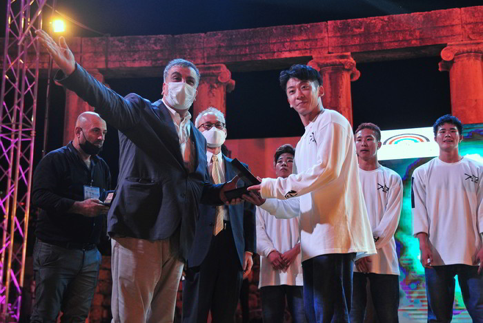 [프레스뉴스] 채정병 특파원=1일(현지시간) 세계적인 대한민국 비보이 그룹 진조크루의 요르단 특별공연이 제라쉬 페스티벌 야외무대에서 펼쳐진 가운데 공연을 마치고 장지광(오른쪽) 수석단원이 마젠 카와르 제라쉬 페스티벌 총 감독으로부터 감사패를 받고 있다.