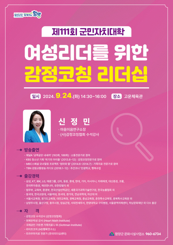 이번 군민자치대학은 군민 모두가 의사소통에서 자신의 감정을 알고 활용할 수 있는 코칭을 통해 정서적 안정과 원활한 소통을 할 수 있는 ‘여성리더를 위한 감정코칭 리더십’을 주제로 진행된다.