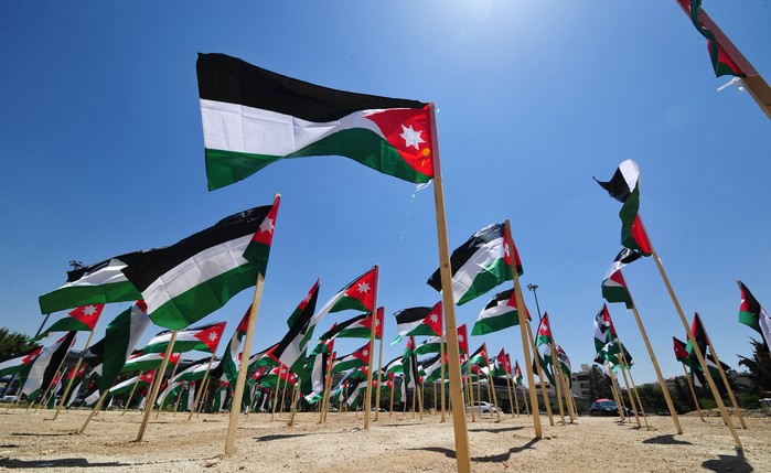 [프레스뉴스] 채정병 특파원=25일(현지시간) 제76주년 요르단 독립기념일을 맞아 설치된 국기광장에서 요르단 국기들이 펄럭이고 있다.