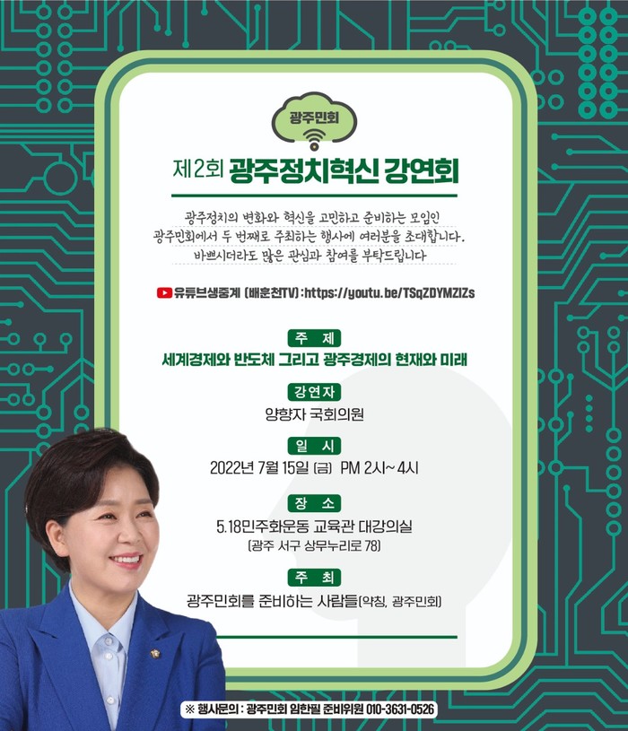 [광주=프레스뉴스] 강래성 기자= ‘광주민회를 준비하는 사람들’(약칭 광주민회)은 보도자료를 통해서 오는 15일에 5.18민주화운동 교육관 대강의실에서 광주시민 100여명이 참가한 가운데 양향자 국회의원(서구을, 무소속)이 발표하는 ‘세계경제와 반도체 그리고 광주경제의 현재와 미래’라는 주제로 제2차 광주정치혁신강연회 행사를 개최한다고 밝혔다.