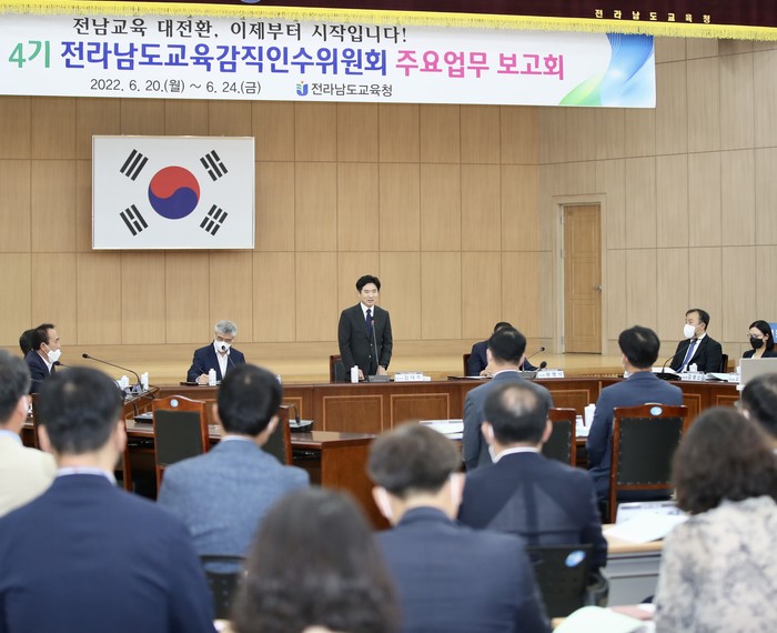 [전남=프레스뉴스] 강래성 기자= 주민직선 4기 전라남도교육감직 인수위원회 첫 업무보고가 6월 20일(월) 오후 2시 전남도교육청 2층 대회의실에서 김대중 전남교육감 당선자를 비롯해 인수위원, 본청 집행부 등이 참석한 가운데 개최됐다.