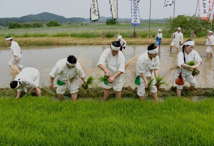 ▲함안농요보존회(회장 이창근)는 지난 5월 31일 법수면 악양둑방 둔치 내 함안농요 체험농장에서 ‘제8회 실제농사 재현행사’를 개최했다. (사진=함안군) |